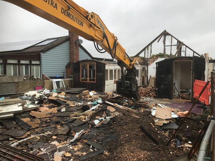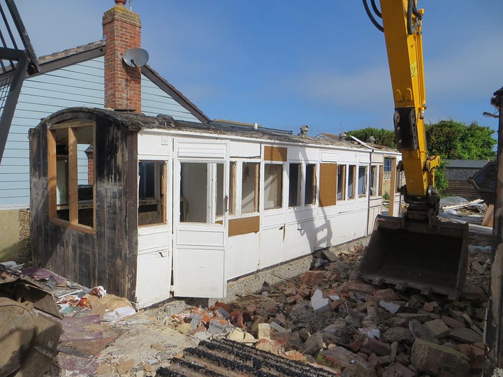 In England, thanks to post-1947 planning legislation, this handmade architecture typically had two fates: demolition or surreptitious survival. In places like Shoreham by Sea, a vast settlement of bungalows made from former railway carriages was substantially destroyed using early compulsory purchase powers (written about at length here), leaving only scattered survivors including the pebble-dashed church. At Dunton, part of Basildon New Town, every plotland home was demolished incrementally except one, which now stands as an unlikely plotland museum in the centre of a nature reserve thanks to the enlightened efforts of conservation volunteers. In places where such destruction was not fully seen-through, examples tended to survive through blending in to the wider ‘normal’ settlement, by ‘becoming normal’ themselves and slowly obscuring or replacing their original tectonic and aesthetic qualities with more mundane or typical forms of cladding, window or roofing panel. And in the context of ever-worsening inequalities and increasingly insane land and property values across much of England, survivors of the period that continued happily on as dwellings are increasingly likely to be swept away in favour of more substantial and higher density dwellings. At Shoreham, when I was a child it was an (admittedly niche) game to try and identify houses that had railway carriages somewhere embedded within them, given away by tell-tale rhythms of windows or occasionally even by original golden lettering: ‘LB&SCR’, ‘third class’. These have now all been swept away; and sadly the loudest preservationist protest has come from the railway history groups and is concerned with preserving not the social history of the settlement or dwelling but rather the original railway carriages. Brilliantly, one such carriage, fully restored to its original 19th century form, is now doing good service on the Bluebell Railway heritage line. As a one-off this is a glorious twist of material fate but it also shares with the demolition imperative the idea that these homes were somehow an aberration or mistake, something best undone or overwritten.