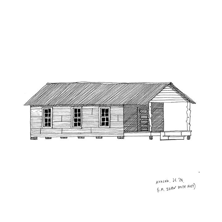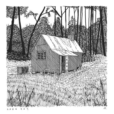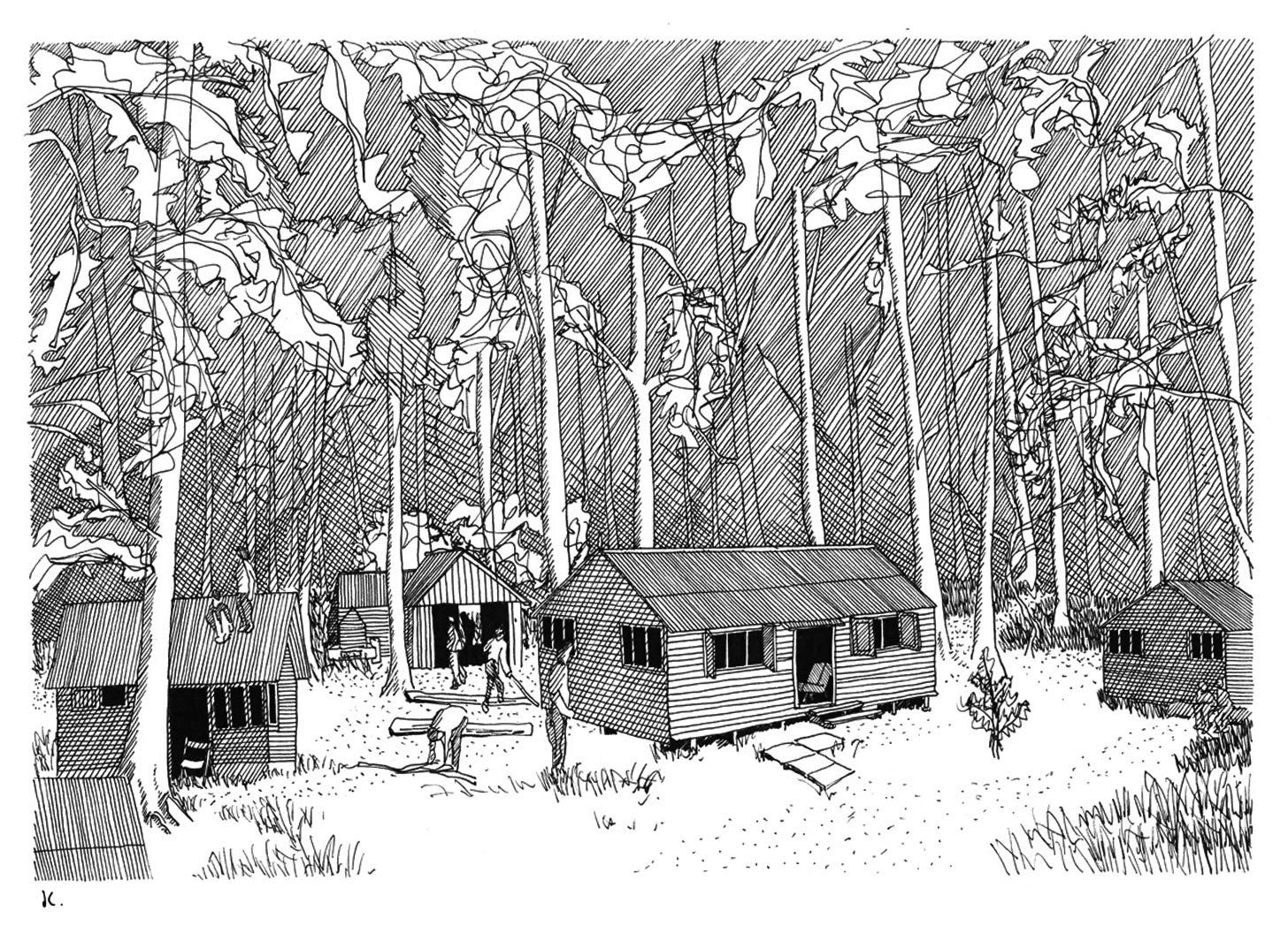 At Dunton and Laindon in Essex, the simple rule - in the absence of public sector involvement - was that every plotholder would lay a single row of paving slabs at the front of their plot in order to build a filigree network of dry pathways across the fields. Residents would use wheelbarrows and prams customised to run on a single wheel to convey goods from the ‘proper’ road to their plots. These forms of collectivised popular construction - where the simple timber dwelling becomes multiple - bring the plotland story into dialogue with other global forms of alternative development - they are cousins of the colonial settlements that took place in New Zealand, for example (the ‘fencibles’), or in Brasil. They are of a piece with the ad-hoc structures not only of the Russian dacha but also of the English allotment shed and the pigeon loft, serving a similar role as refuge and respite. They are closely related to the types of dwelling and settlement structure that Mississippi John Hurt, Dolly Parton, Carl Perkins and Elvis Presley all emerged from in the United States- leading to the one-off preservation of these special examples when all other examples have been long-since cleared away. They are of a family with intentional radical communities of the same era, such as the anarchist colony of Whiteway in Gloucestershire (where every dwelling except the already-standing farmhouse was originally of light timber construction). Or the Sanctuary in West Sussex where Vera Pragnell divvied-up woodland in her ownership amongst a wildly varied community of drop-outs, creatives and those pursuing alternative lifestyles, among them the writer Laurie Lee. Or the greenwood bunkhouses of Grith Fyrd and Forest School Camps, where young men damaged by war were trained to build dwellings and exist in harmony with nature, healing their lungs as they went (the results of whose labours were still standing when I was a child and are now long gone). Or the very similar structures developed by the Woodcraft Folk in places like Cudham or West Hoathly in order to give urban children the gift of the countryside. Or the decorative timber vardo caravans of the Roma tradition, intricately crafted and yet lightweight enough to be pulled day-in, day-out by solo horses. Or the post-WW1 hutting movement that led to whole neighbourhoods of woodland dwellings for ex-servicemen in the Scottish countryside. Or to the long, ancient tradition of timber-framed dwellings in Sussex, Kent and elsewhere - examples of which are now subject to the highest levels of conservation and heritage designation. Or, to the northern Portuguese fishing towns whose timber palheiros, endlessly rebuilt and with their long timber foundations reaching deep into the sand, resisted redevelopment along more conventional lines well into the twentieth century. All of these familial connections are subjects of drawings I have made in recent years, which aim to commemorate, memorialise and recall these structures and their quiet radicalism as they otherwise drift from view and social memory. I try to use a form of drawing that echoes, I hope, the simplicity, clarity and optimism of the original construction.
