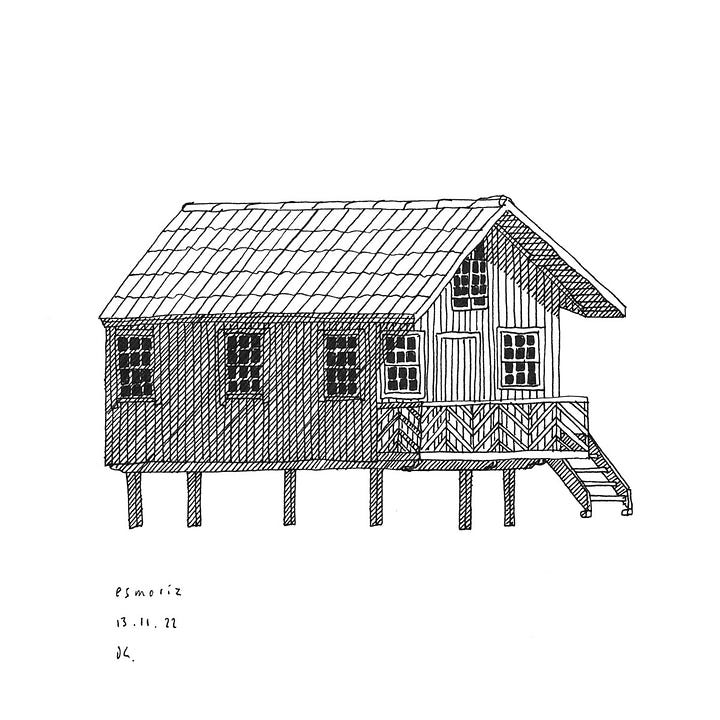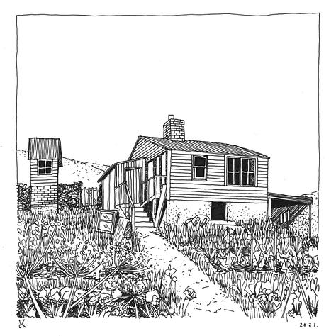 The game of ‘handmade house spotting’ is getting increasingly hard to play, the joy of finding new subjects for a drawing increasingly challenging. Examples of the type across the UK are frequently lost without ceremony, and without regular painting and maintenance, such lightweight timber structures decay rapidly: built by hand, they require regular attention by hand as well. In the intervening decades, ‘self-build’, when not acting under the radar against tremendous odds, has drifted into becoming a rich person’s game: Grand Designs culture, the granite worktop and the uPVC bi-folding door. This social and material drift gets perhaps to the heart of the significance of these structures beyond their architectural curiosity, to the core of why we need a more concerted and strategic effort to preserve them alongside other twentieth century structures. They are a tangible but shrinking reminder of one of the most significant and contentious transformations in the British landscape - a popular reclamation of rural and coastal beauty, undertaken by the working classes on their own terms, with their own hands, and with a renewable and low-impact material. A reclamation that has lessons to teach us in the present, and which echoes still in our culture, quieter each day.
